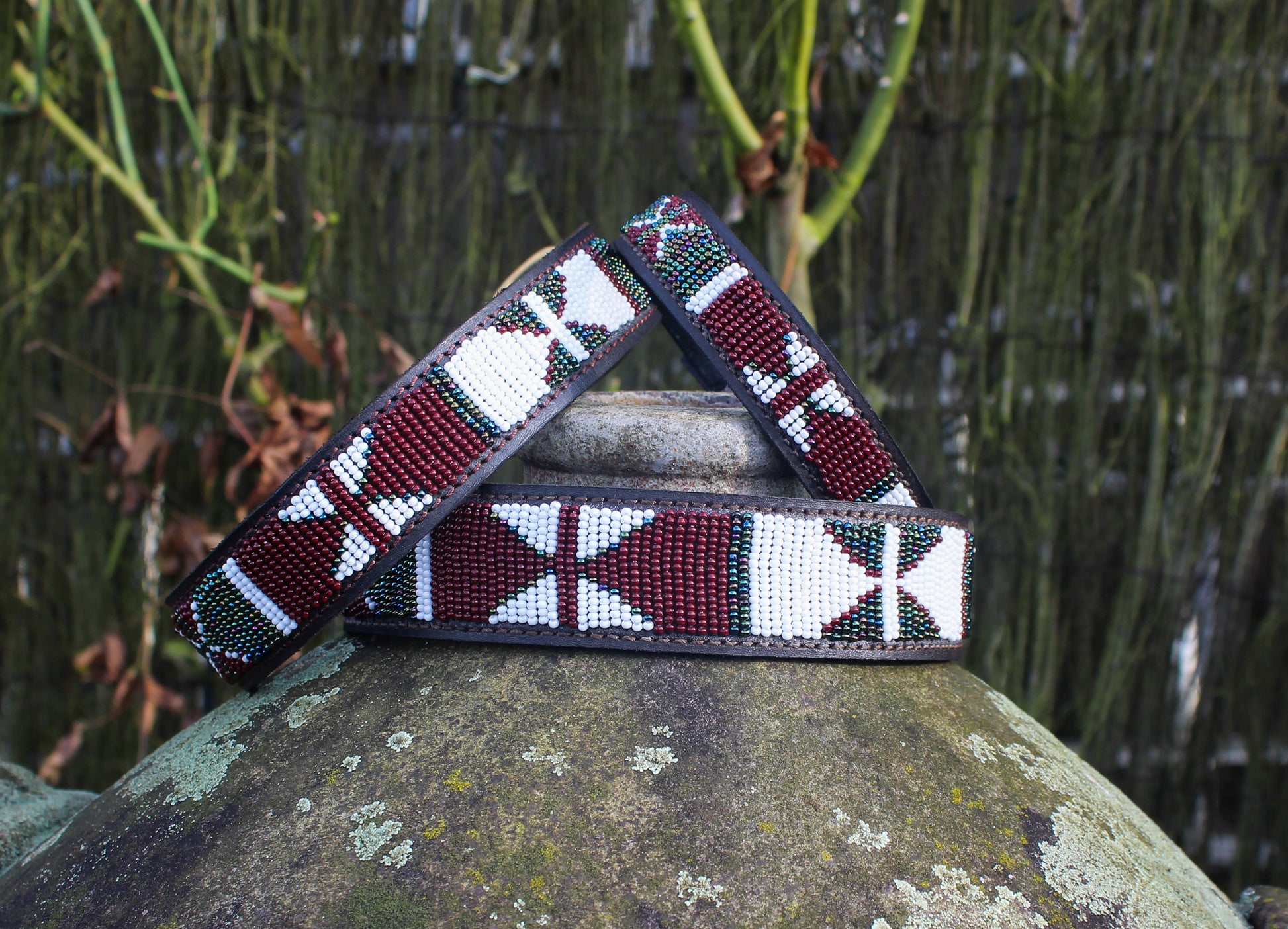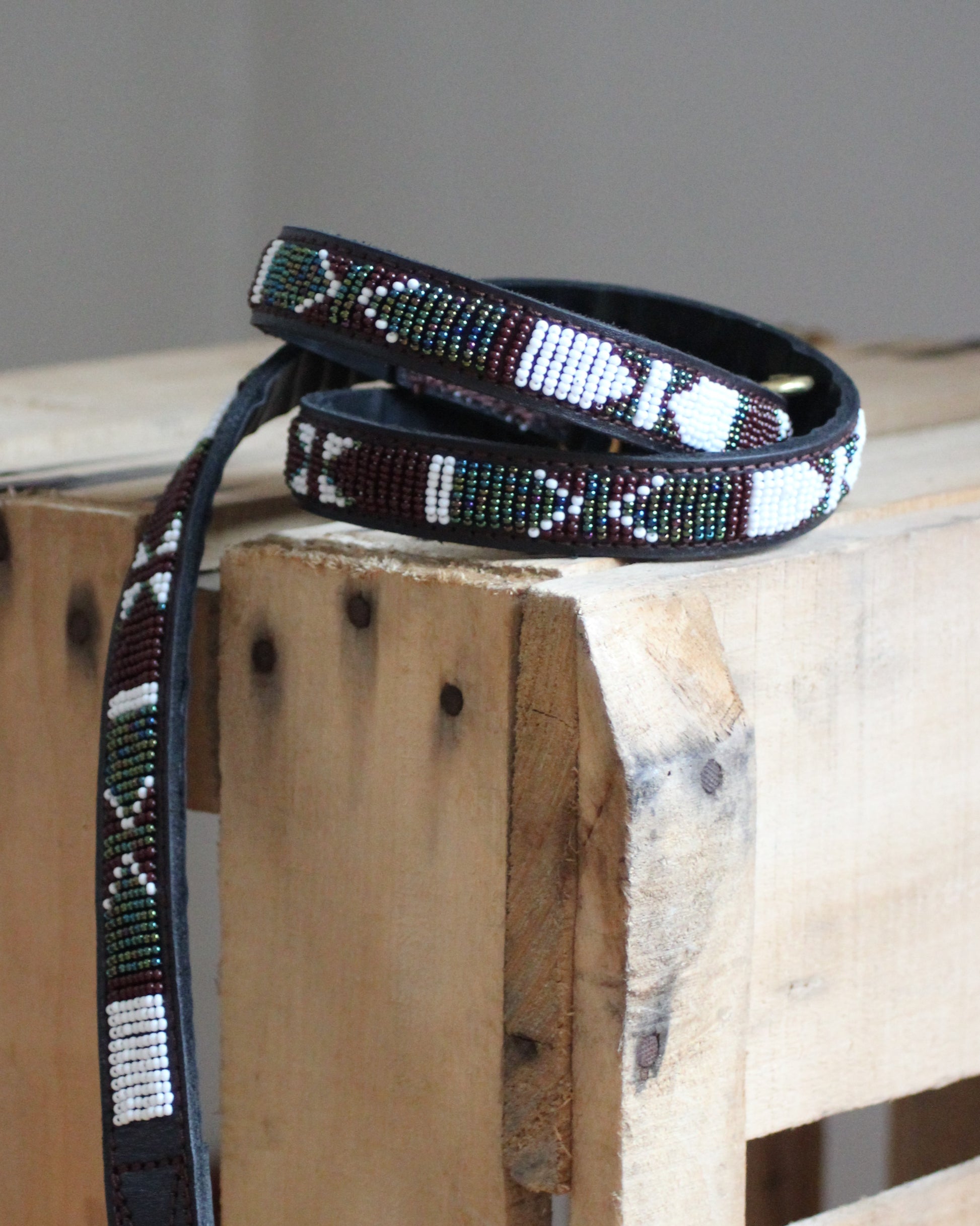 Quality brown leather dog leash, decorated with beautiful ceramic beads in unique designs. The brass buckles are 100% recycled.