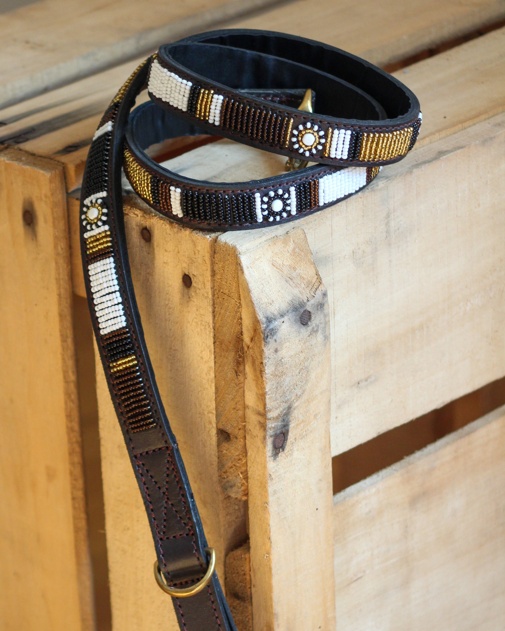 Quality brown leather dog leash, decorated with beautiful ceramic beads in unique designs. The brass buckles are 100% recycled.