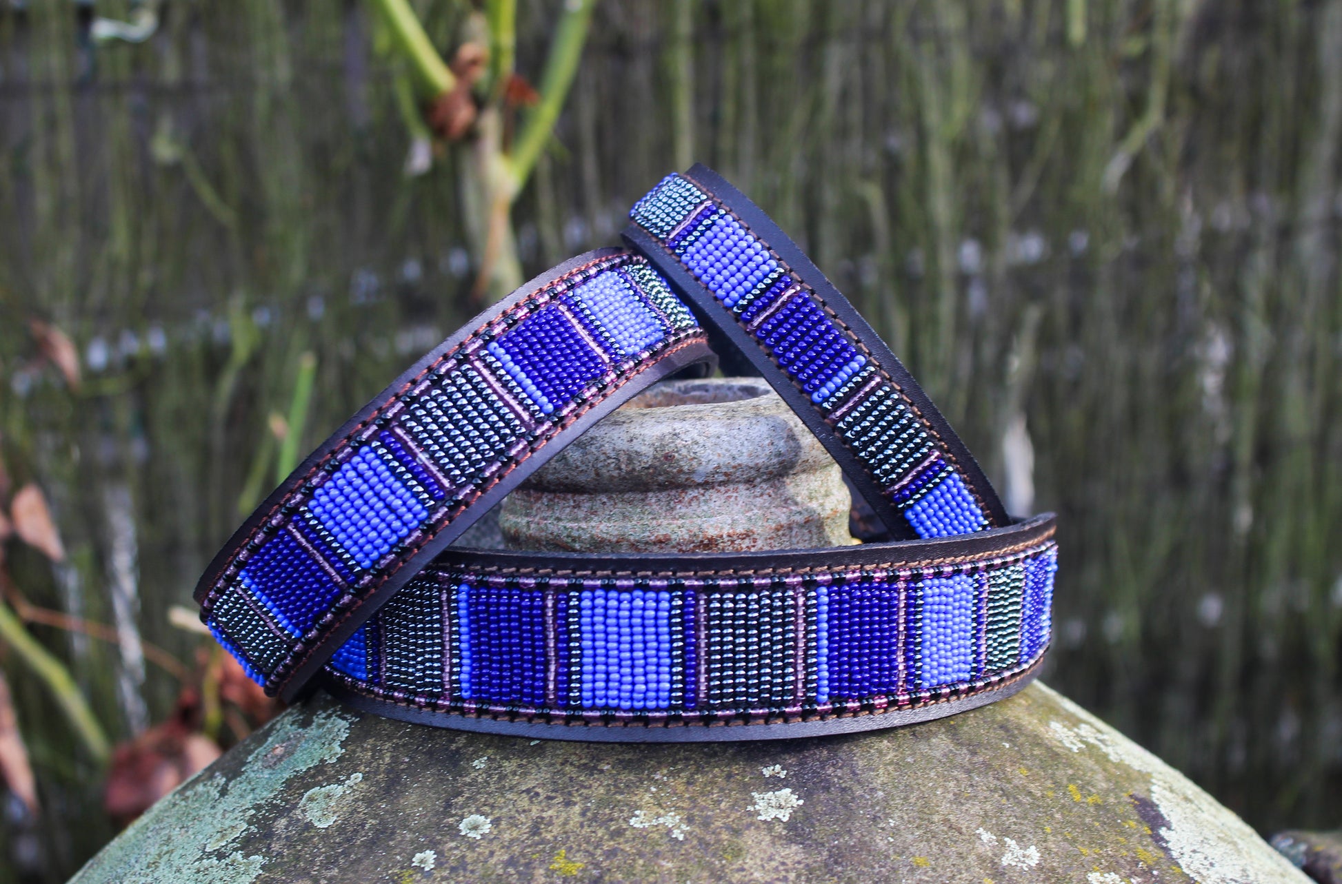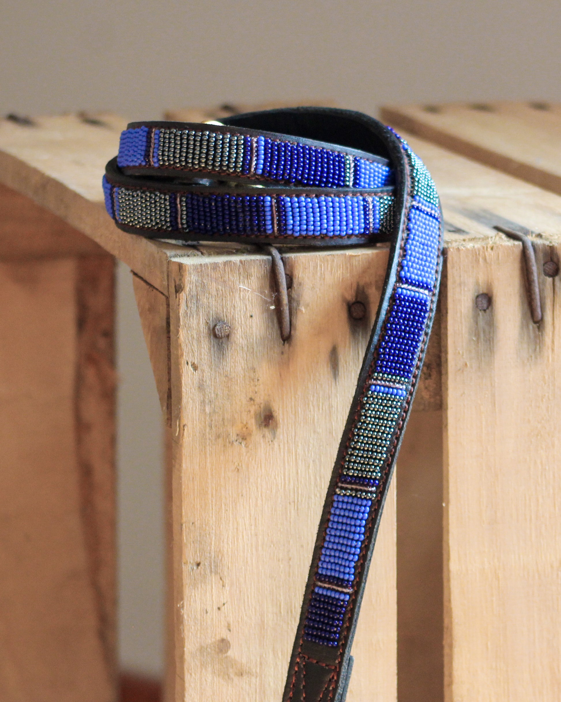 Quality brown leather dog leash, decorated with beautiful ceramic beads in unique designs. The brass buckles are 100% recycled.