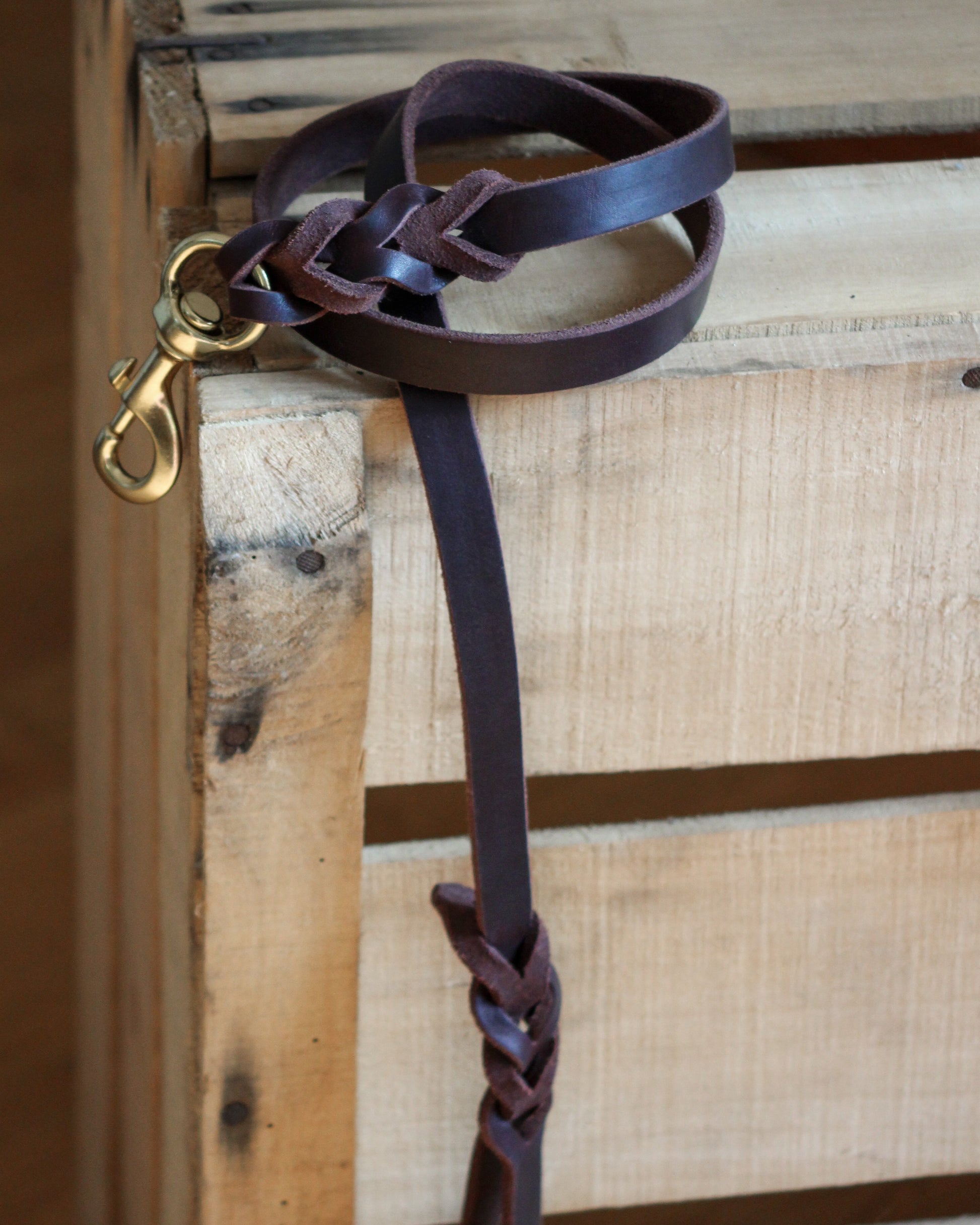 Quality brown leather dog leash made from genuine leather, braided details on both sides. The brass buckles are 100% recycled.