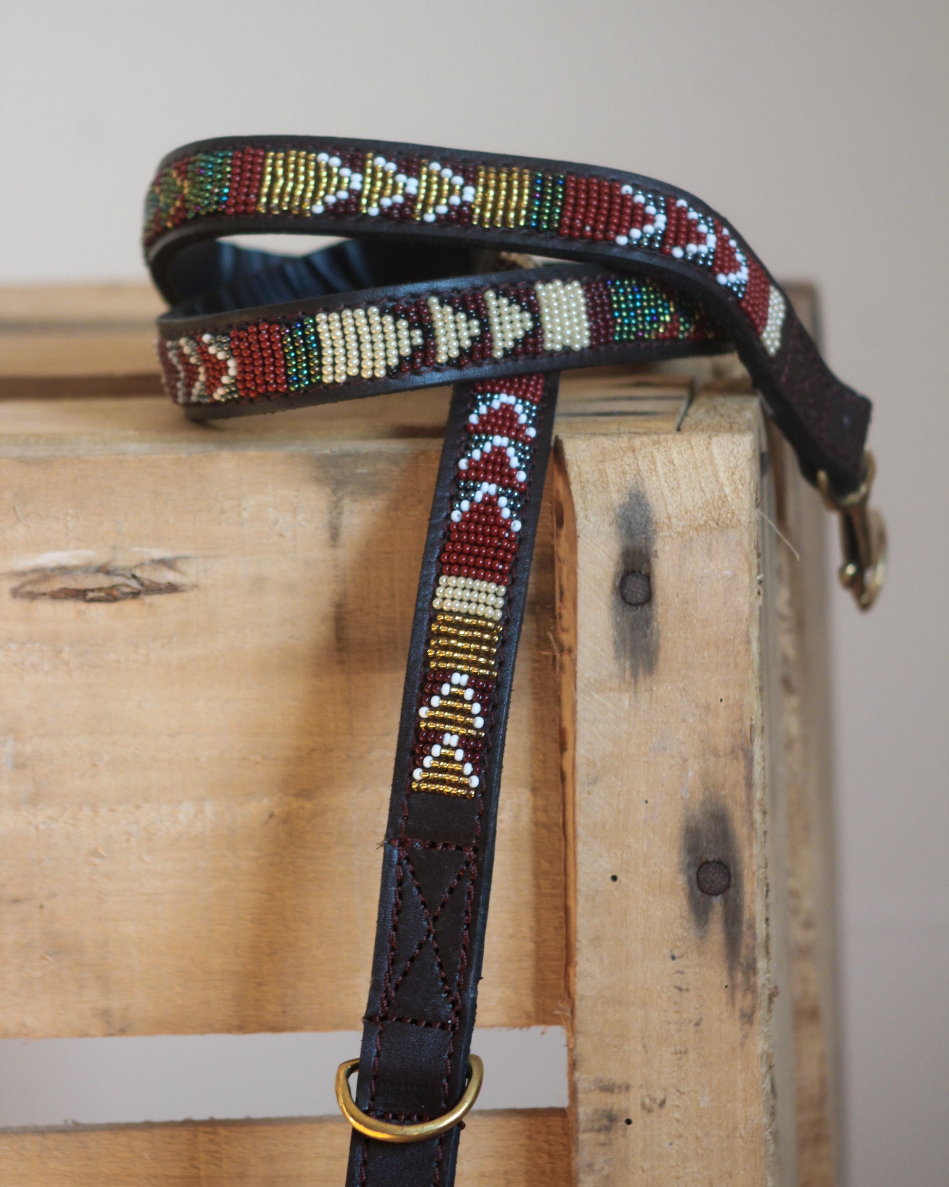 Quality brown leather dog leash, decorated with beautiful ceramic beads in unique designs. The brass buckles are 100% recycled.