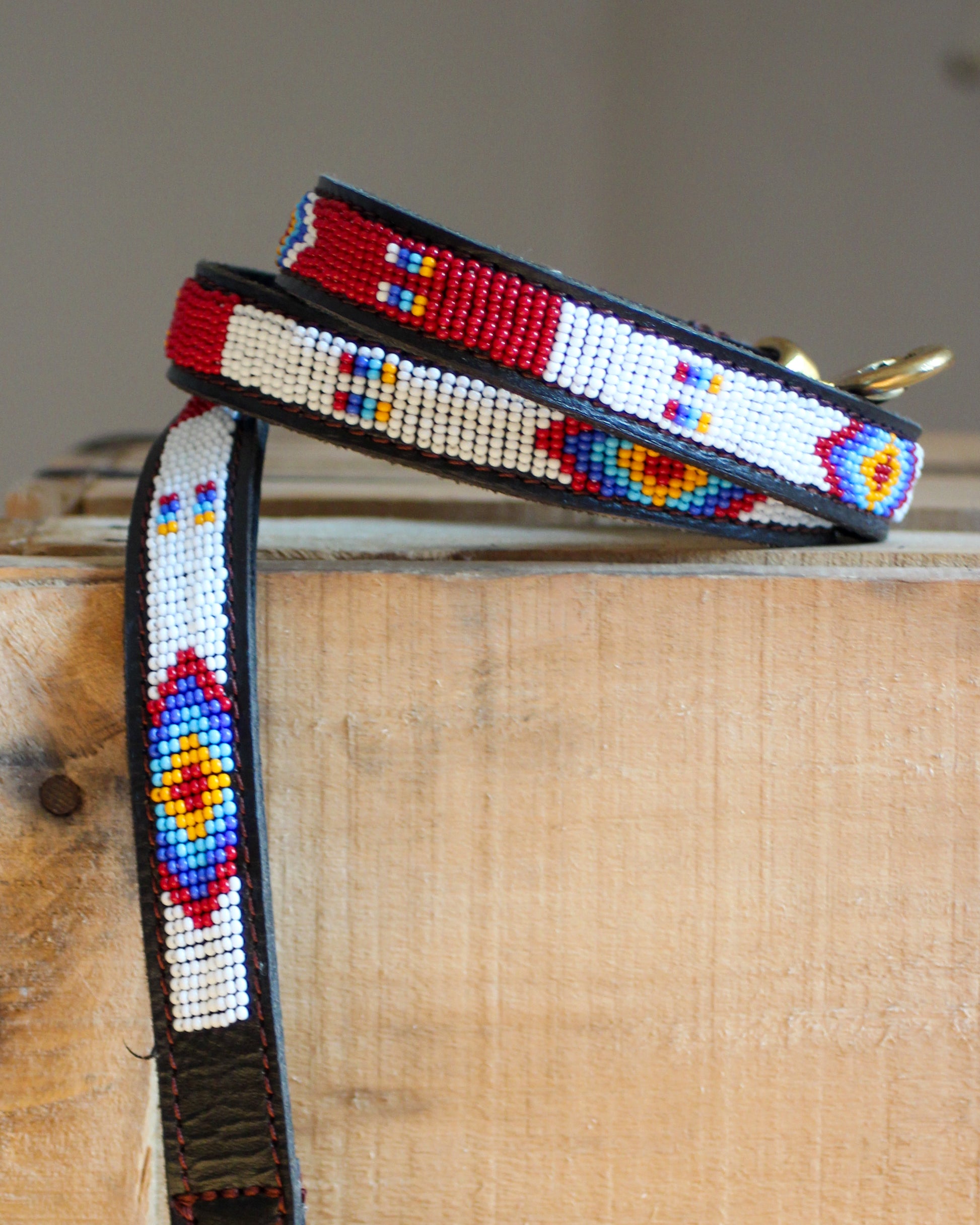 Quality brown leather dog leash, decorated with beautiful ceramic beads in unique designs. The brass buckles are 100% recycled.
