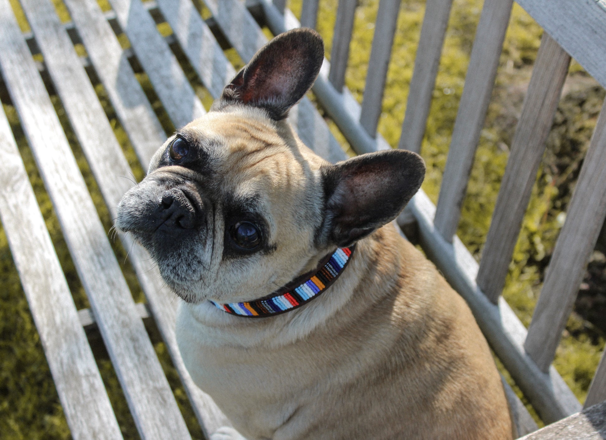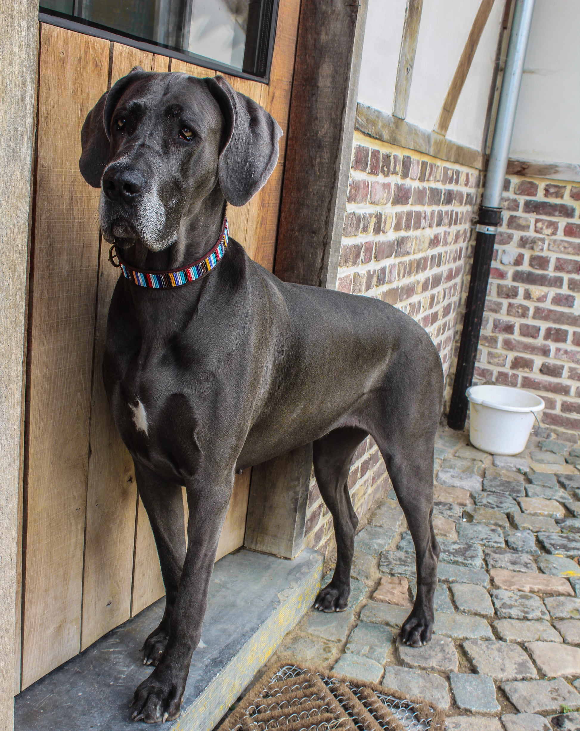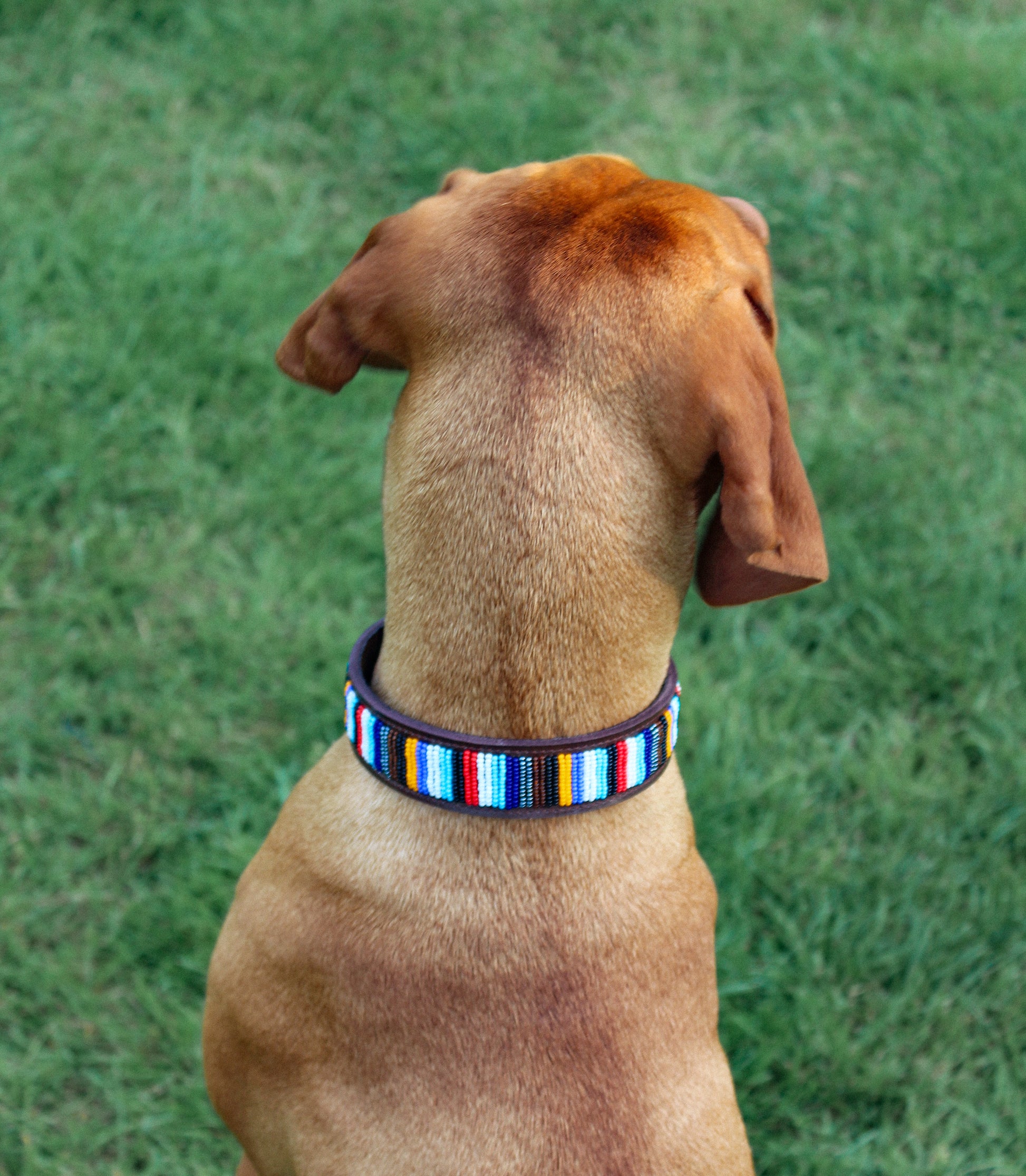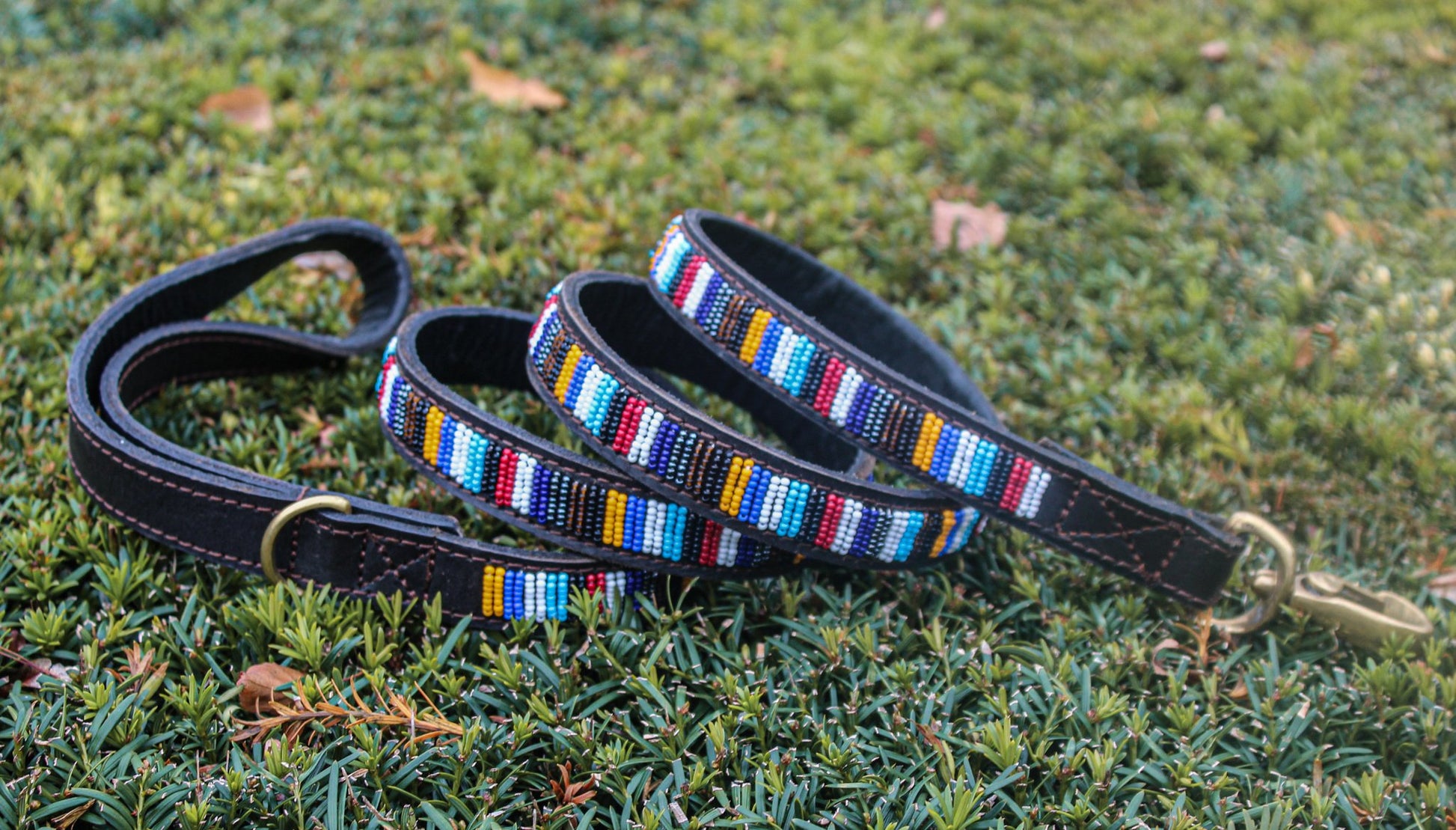 Quality brown leather dog collar, decorated with beautiful ceramic beads in unique designs.The brass buckles are 100% recycled.