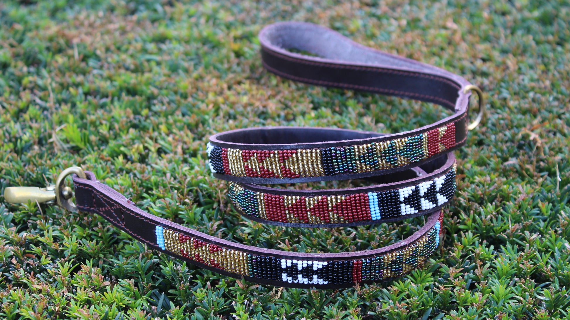 Quality brown leather dog leash, decorated with beautiful ceramic beads in unique designs. The brass buckles are 100% recycled.