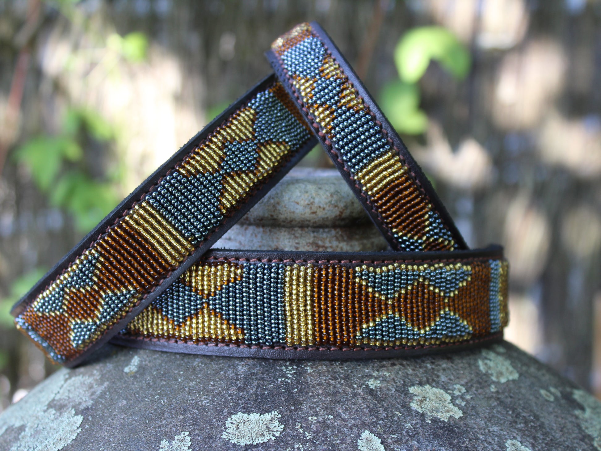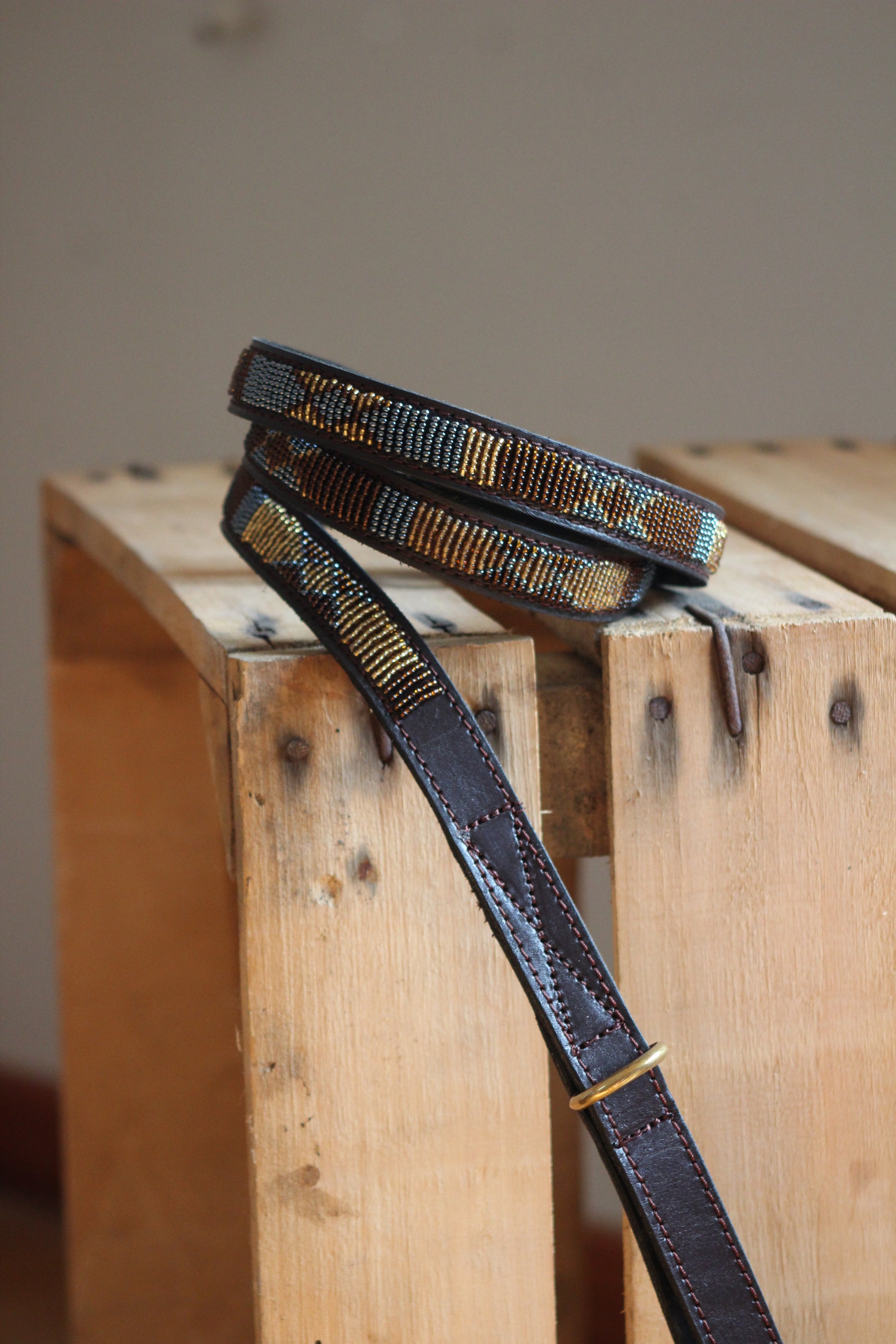 Material: leather, ceramic beads, recycled brass
