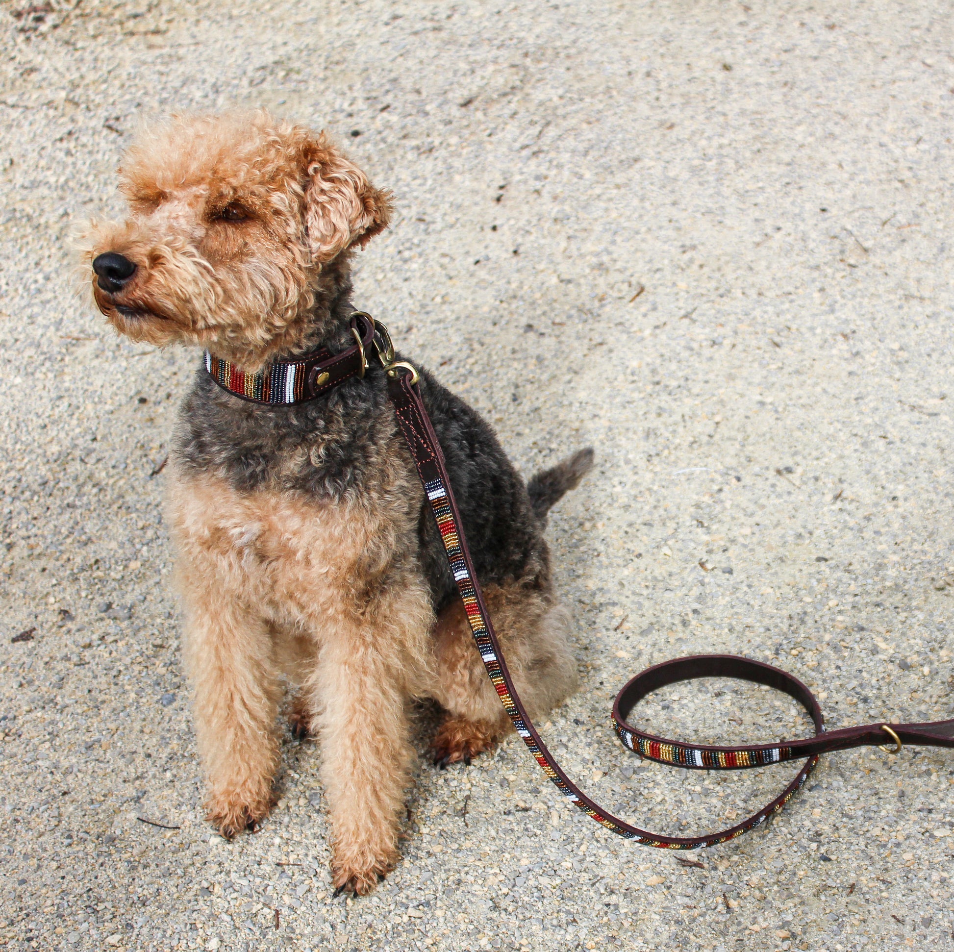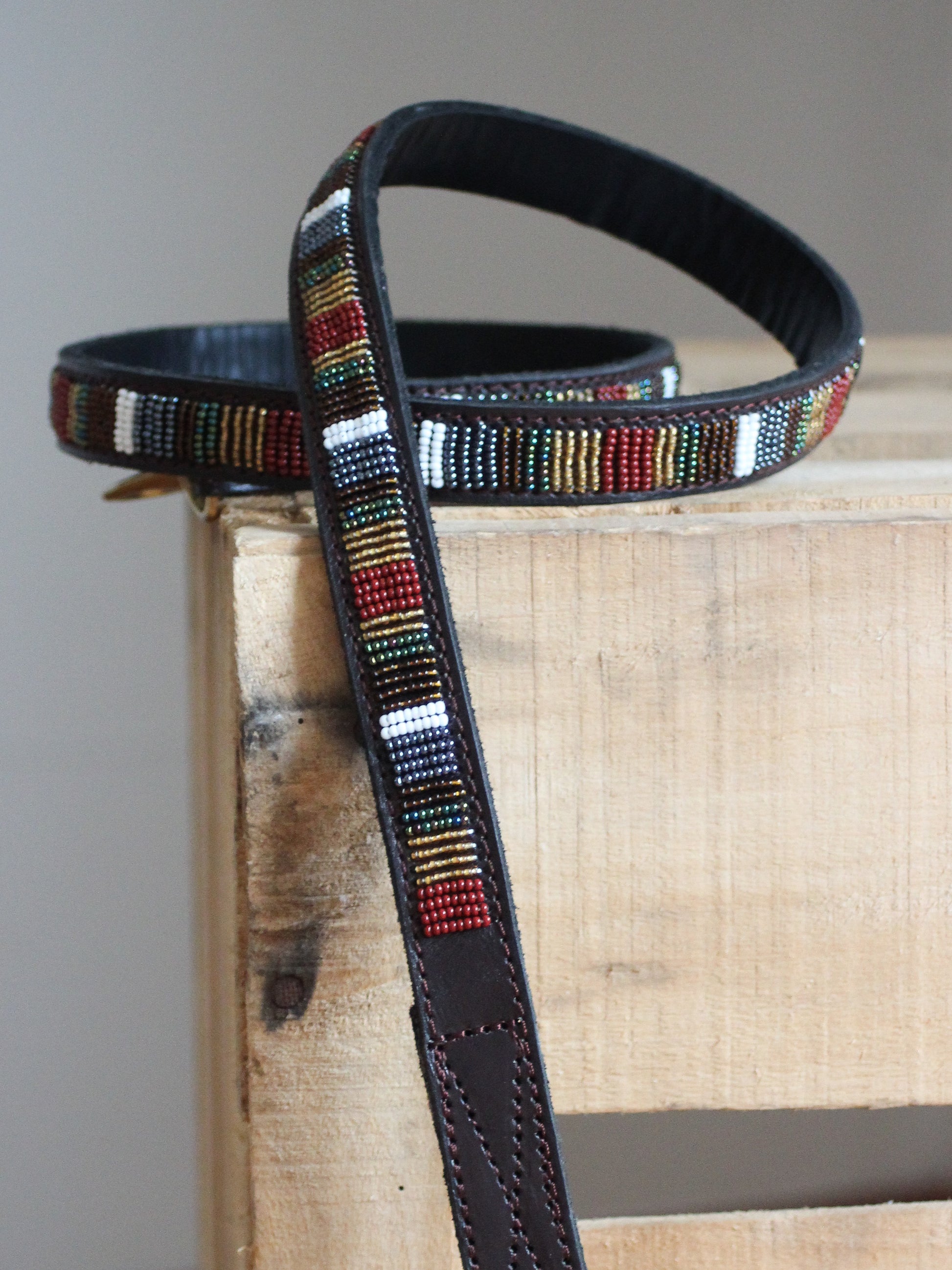 Quality brown leather dog leash, decorated with beautiful ceramic beads in unique designs. The brass buckles are 100% recycled.