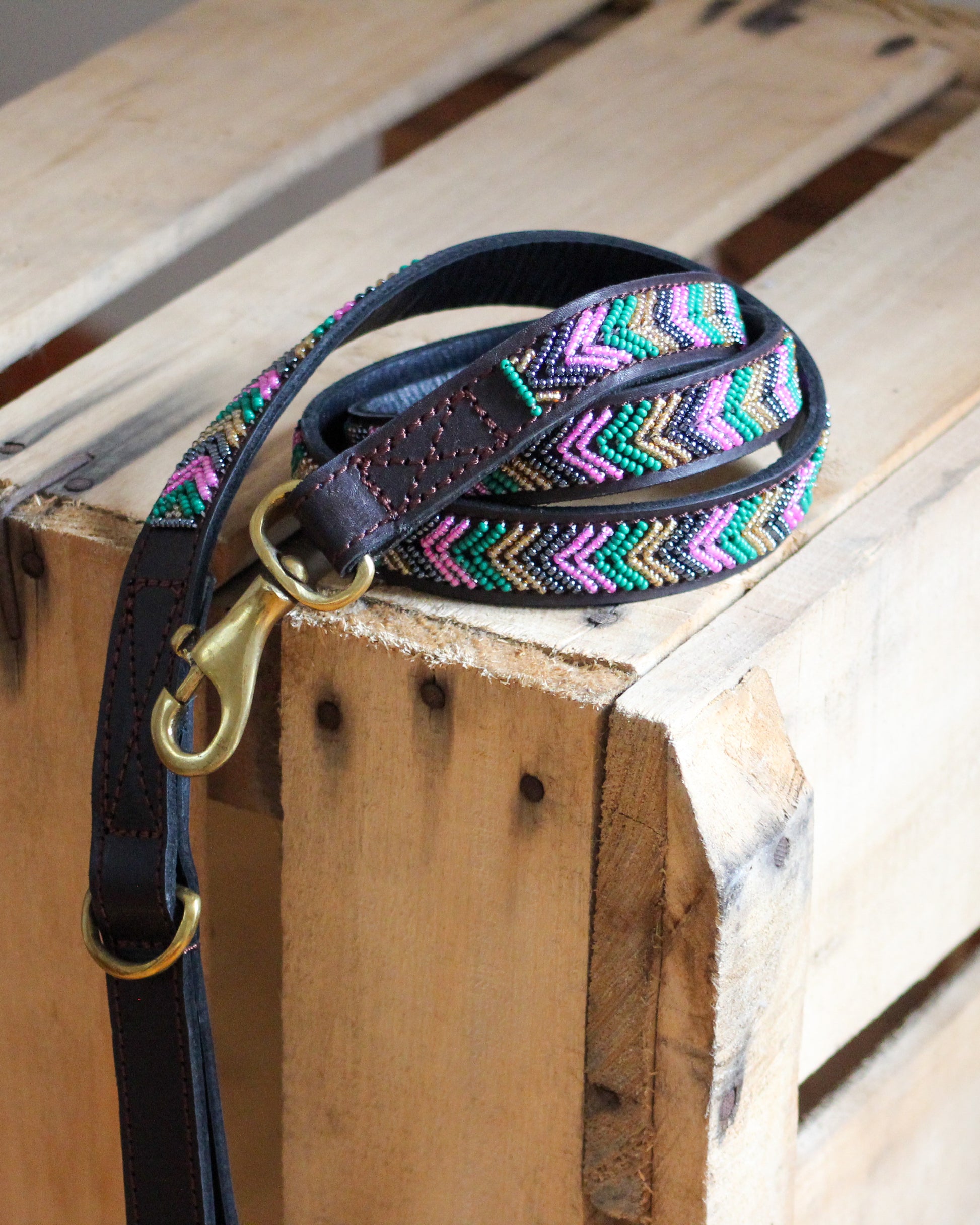 Quality brown leather dog leash, decorated with beautiful ceramic beads in unique designs. The brass buckles are 100% recycled.