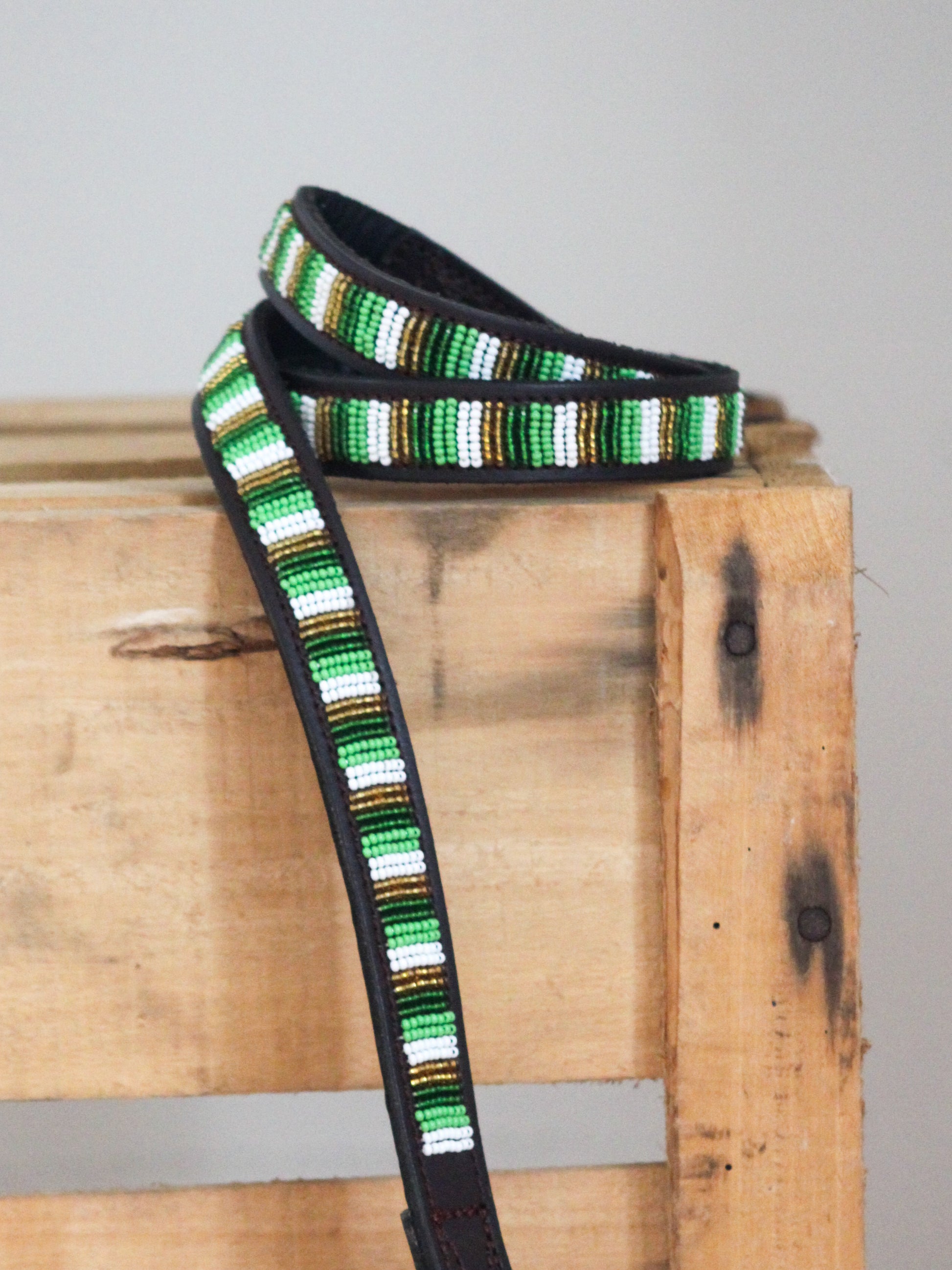 Quality brown leather dog leash, decorated with beautiful ceramic beads in unique designs. The brass buckles are 100% recycled.