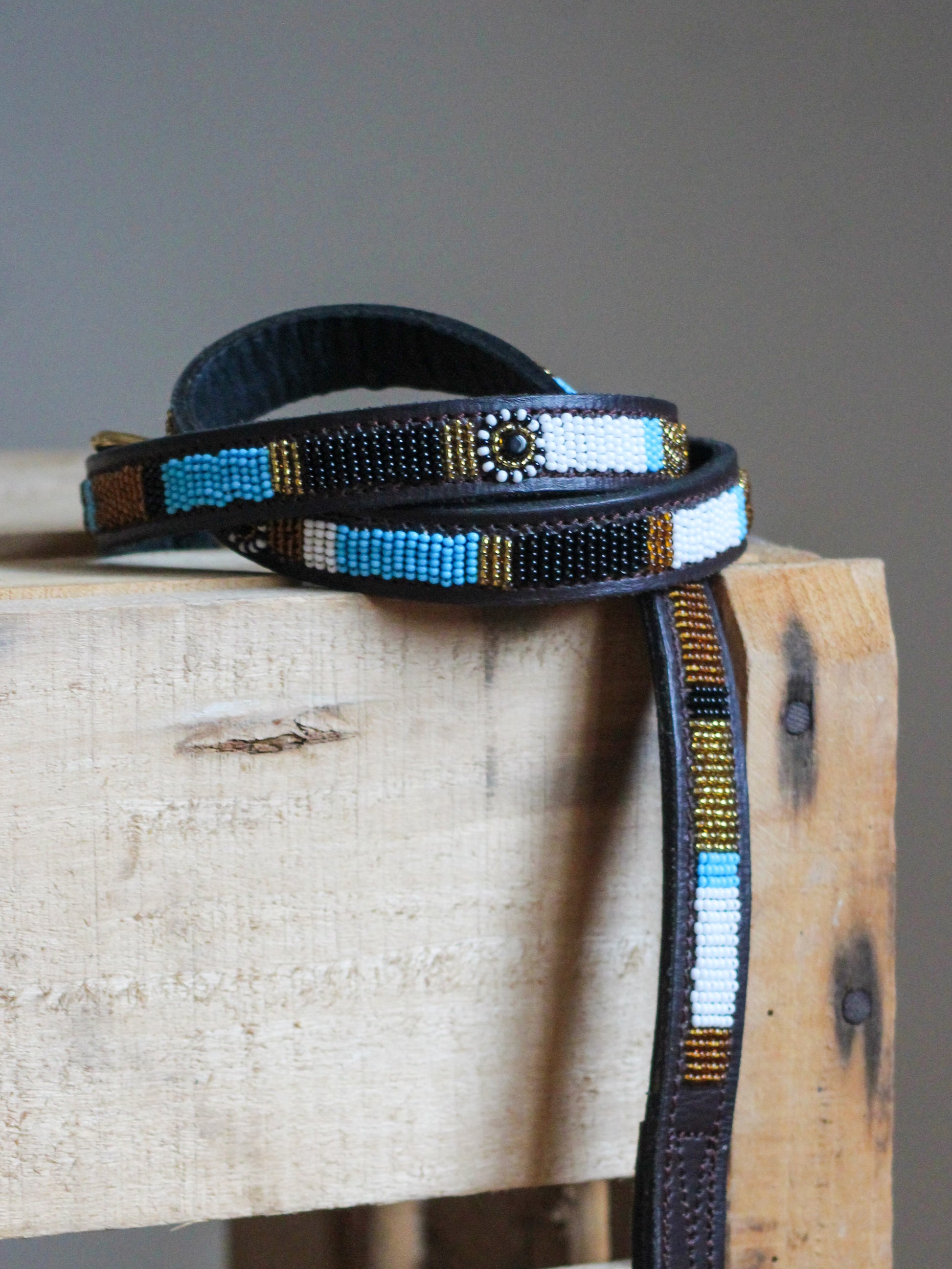 Quality brown leather dog leash, decorated with beautiful ceramic beads in unique designs. The brass buckles are 100% recycled.