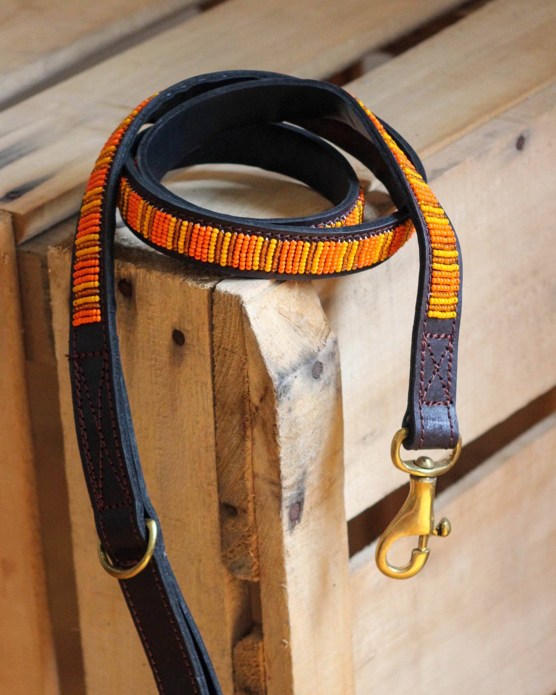 Quality brown leather dog leash, decorated with beautiful ceramic beads in unique designs. The brass buckles are 100% recycled.
