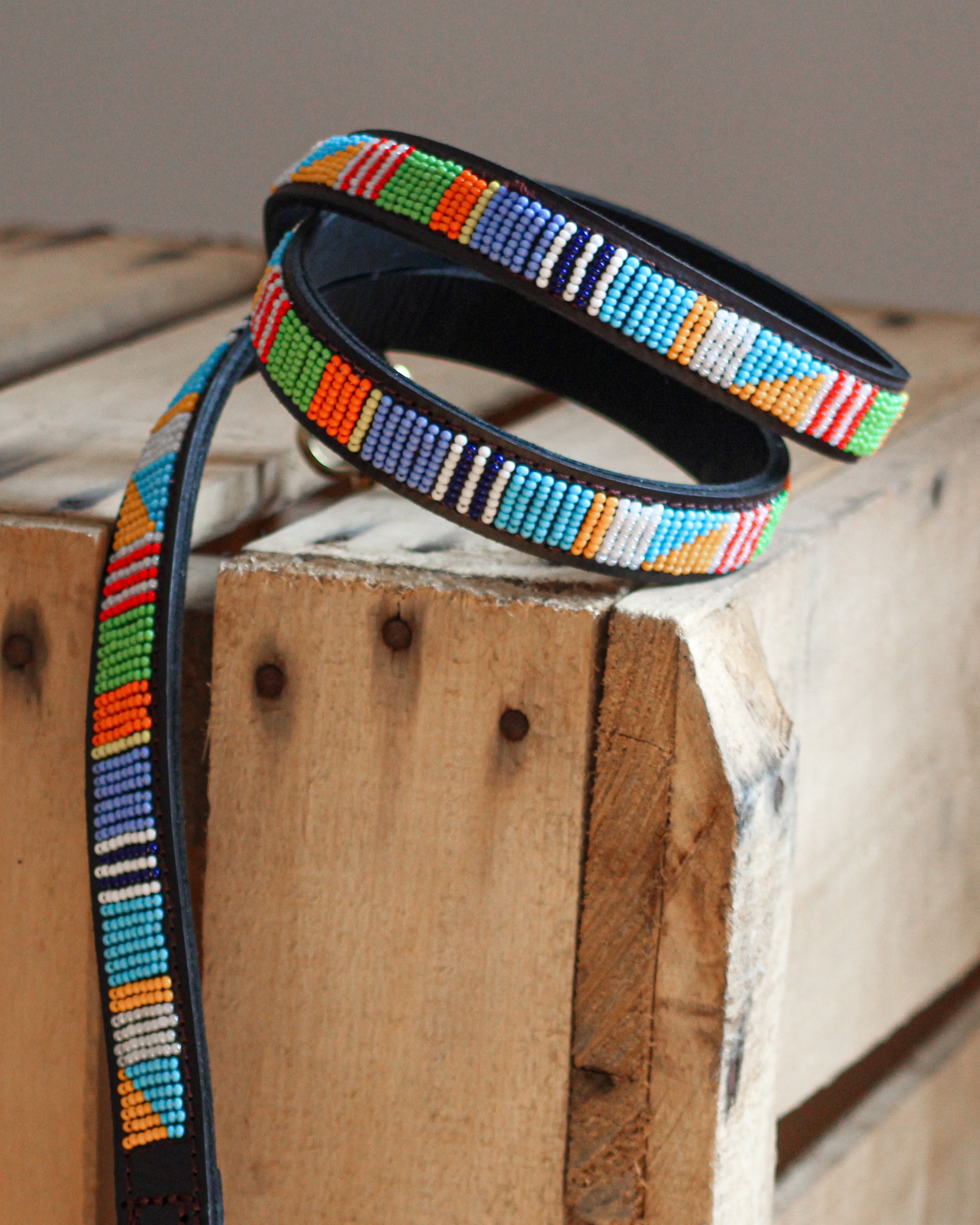 Quality brown leather dog leash, decorated with beautiful ceramic beads in unique designs. The brass buckles are 100% recycled.