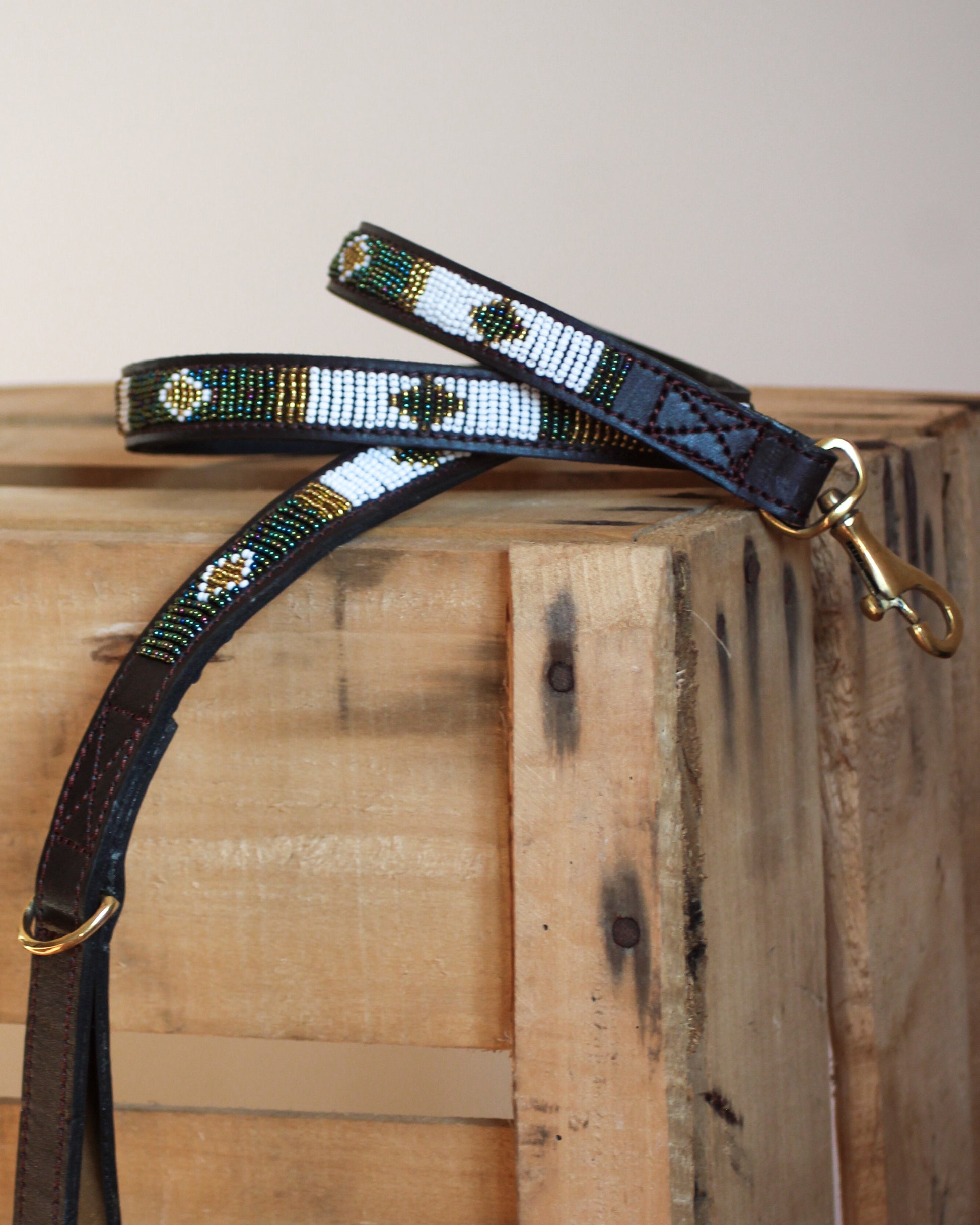 Quality brown leather dog leash, decorated with beautiful ceramic beads in unique designs. The brass buckles are 100% recycled.