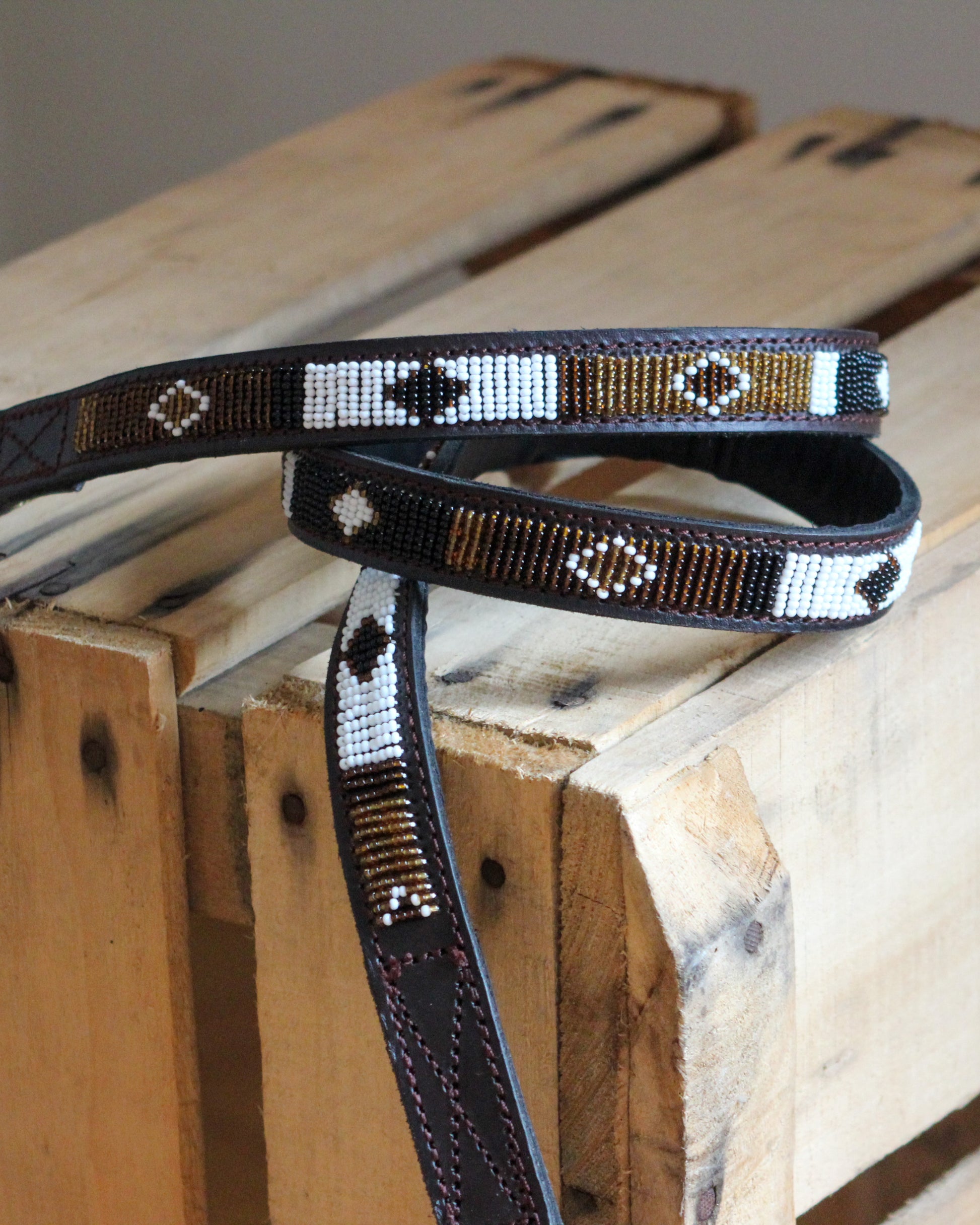 Quality brown leather dog leash, decorated with beautiful ceramic beads in unique designs. The brass buckles are 100% recycled.